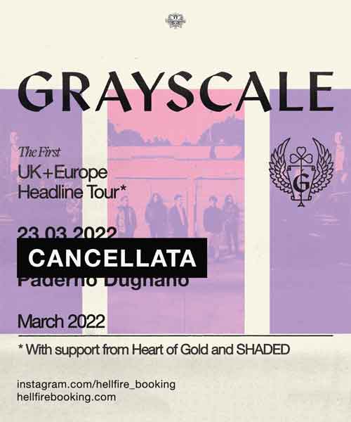 I Grayscale, accompagnati da Heart of Gold e SHADED, sarebbero dovuti passare dall’Italia per un’unica data – prevista il 23 marzo allo Slaughter Club di Paderno Dugnano – per concludere l’intero tour con una serata da sogno.