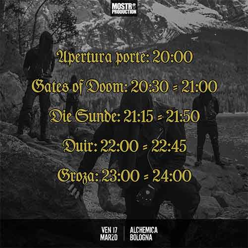 Il 17 marzo all’Alchemica Music Club di Bologna saranno protagonisti sul palco i tedeschi Groza. La band black metal sarà preceduta da tre band elencate di seguito secondo i dettagli degli orari ufficiali: