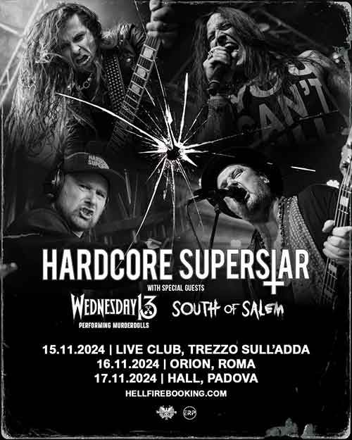 Hellfire Booking Agency annuncia gli inglesi South Of Salem come suppporto a Hardcore Superstar, accompagnati da Wednesday 13 nei panni dei Murderdolls. Il tutto per tre date in Italia per questo novembre. Trezzo Sull’Adda (MI), Roma, Padova sono le mete dei protagonisti.