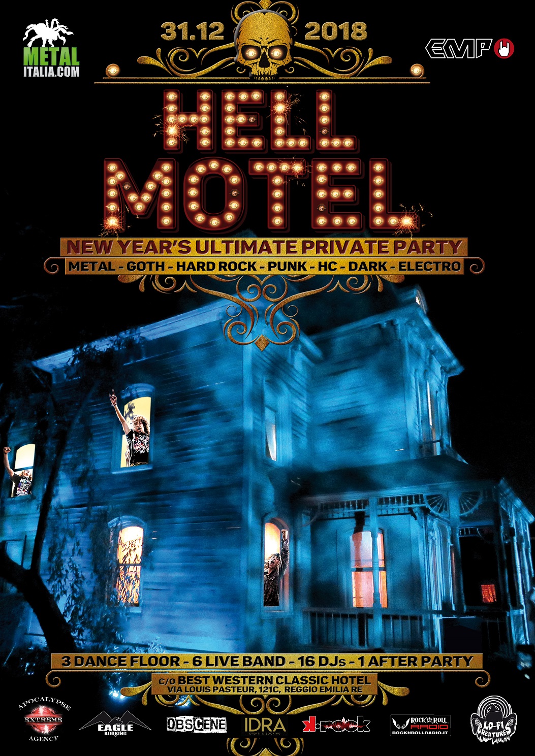 Una festa così non l’avete mai vista!” Ecco l’esclamazione di uno degli addetti ai lavori parlando dell’evento, unico del suo genere, che andremo a presentare per le celebrazioni dell’anno nuovo. Finalmente, per le persone che amano vivere in modo alternativo, per gli amanti del rock e del metal, per chi ha voglia di qualcosa di davvero diverso e completo, o semplicemente per chi vuole avere tutto (ma proprio tutto) in un’unica soluzione, senza dover pensare ai dettagli come dove cenare, o a chi guida dopo la festa: da oggi nasce HELL MOTEL PARTY “new year’s ultimate private party”.
