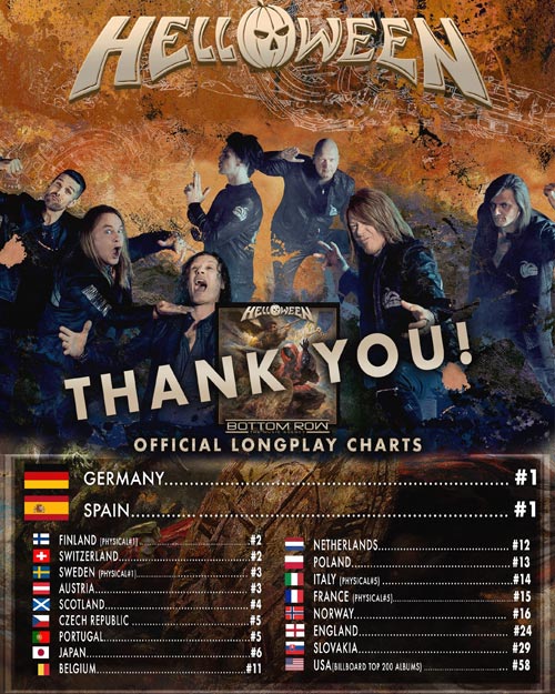Gli HELLOWEEN hanno pubblicato l’album che ogni fan del metal ha atteso a lungo, senza dubbio il disco metal dell’anno! Il nuovo “Helloween” (recensione qui) ha raggiunto i piani alti delle classifiche in tutto il mondo, registrando tra l’altro un incredibile #1 in Germania e Spagna, oltre al numero 1 nelle classifiche fisiche di Svezia, Finlandia e in quella rock britannica.