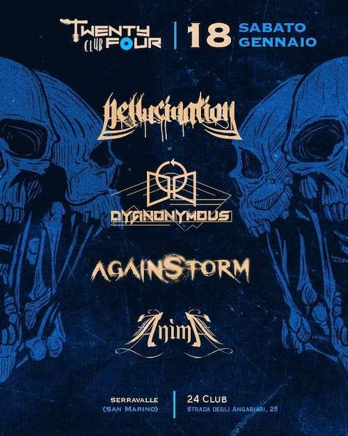 Nuovo appuntamento live dalle sonorità estreme al 24 Club di San Marino. Il 18 gennaio 2020 saranno ospiti al 24 Club quattro band del panorama underground italiano. Ad aprire la serata un’accoppiata di Alternative Metal sperimentale, gli AnimA da Reggio Emilia seguiti dagli Againstorm da Correggio. Mantenendoci sempre in ambito Alternative Metal a seguire i Dyanonymous da Carpi, per loro la prima data con la nuova formazione con Michele “Dr. Viossy” Vioni alla chitarra. In veste di headliner ci saranno gli Hellucination da Roma con il loro Modern Death Metal.