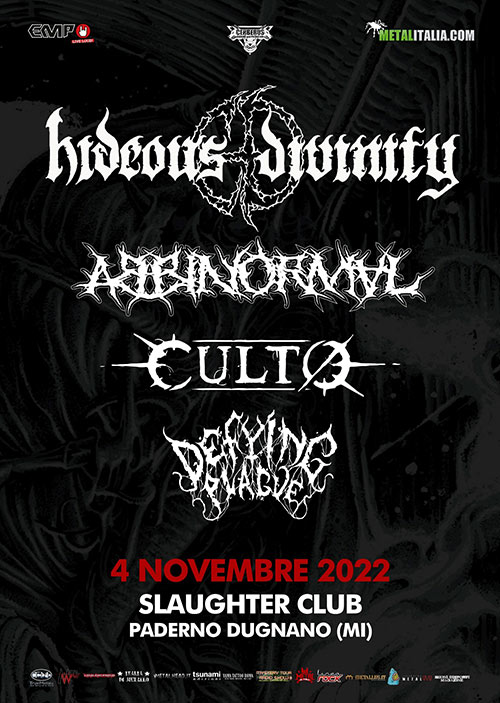 Con un video disponibile QUI, Enrico “H.” Di Lorenzo, frontman degli Hideous Divinity, vi invita alla serata che si terrà il prossimo 4 novembre, presso lo Slaughter Club di Paderno Dugnano (MI). A grande richiesta, la band romana tornerà ad esibirsi nel capoluogo lombardo dopo anni assenza.