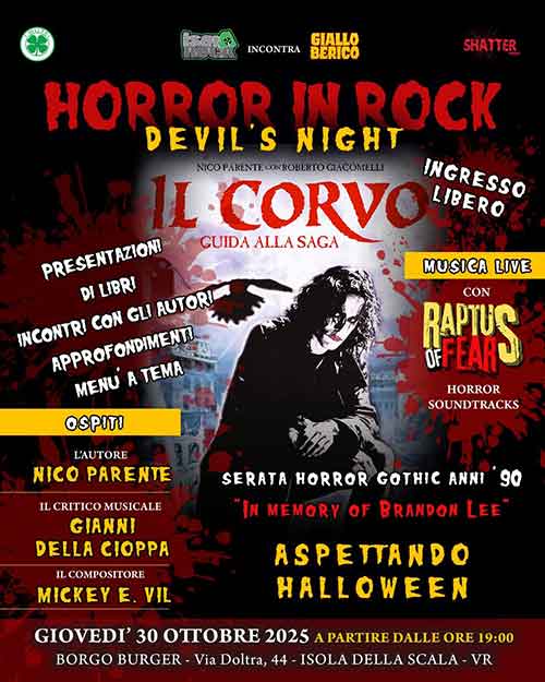 Il 30 ottobre, a Isola della Scala, tributo gotico a Il Corvo aspettando Halloween. Horror, gothic e cultura dark per un tributo a un film cult senza tempo. Isola della Scala, 27 settembre 2025 – La notte del 30 ottobre, alle porte di Halloween, Isola della Scala si tingerà di nero: torna l’appuntamento dedicato alla cultura del brivido “HORROR IN ROCK”, che per l’occasione realizza una speciale “DEVIL’S NIGHT”, una serata unica che unirà musica, cinema e letteratura in un intenso omaggio al film cult Il Corvo, pellicola anni ‘90 diretta da Alex Proyas e tratta dall’omonimo fumetto di James O’Barr, entrata di diritto nella leggenda anche per la tragica e prematura scomparsa di Brandon Lee sul set.