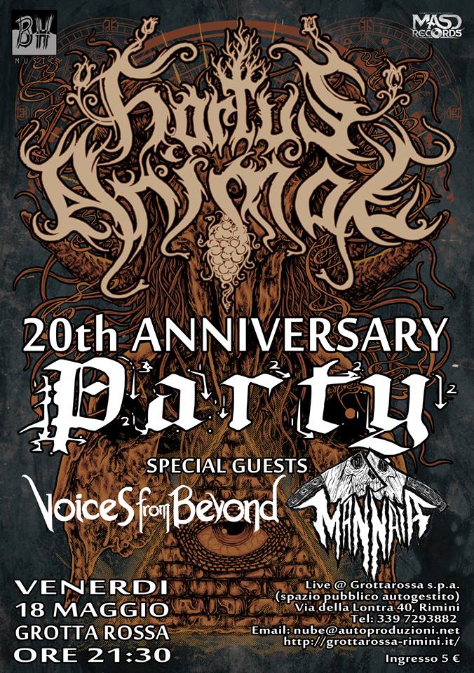 Venerdì 18 maggio 2018, presso lo Spazio Autogestito GROTTA ROSSA a Rimini, gli HORTUS ANIMAE presentano il loro ultimo album. Uno speciale live intitolato “PIOVE SANGUE” uscito per, Masd Records, BlackHeavens Musi, Aesthetic Death Records, Azermedoth Records, che vuole festeggiare i vent’anni di carriera della band. “Piove Sangue” è uscito il 14 febbraio 2018 e nel corso della serata si potranno trovare a disposizione le splendide copie fisiche realizzate sia in digipak sia in versione vinile.