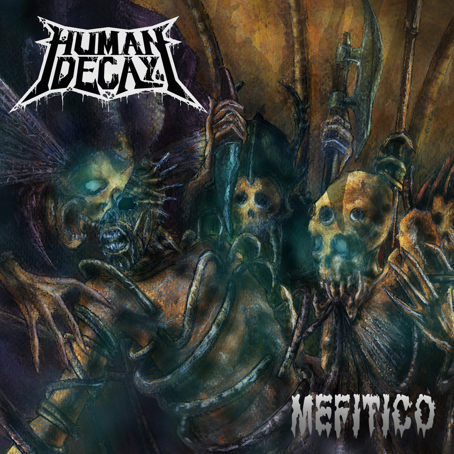 Gli Human Decay da sempre trattano, alcune volte anche in maniera un po’ grottesca, i temi che più ci opprimono e ci indignano in questa società arrivata ormai al limite della deumanizzazione. “MEFITICO” approfondisce ancora questi temi, di una società ormai marcia, putrescente, mefitica, che nel suo marcire contamina anche noi con le sue esalazioni, intrappolandoci sempre più in questo fango distruttivo, costringendoci e bloccandoci all’interno dei suoi ingranaggi che portano sempre più verso l’alienazione e l’autodistruzione, nel cercare di salvare il salvabile per i potenti che stanno ai vertici, politici, religiosi ed economici. L’unica maniera che abbiamo per rimanere aggrappati a quel poco di lucidità e non cadere nell’oblio della lobotomia sociale è aggrapparsi a quelle urla che abbiamo dentro, farle crescere e gridarle contro il mondo.