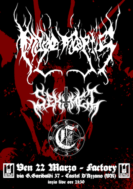 Venerdì 22 marzo, ci sarà una serata dedicata al Black Metal più oscuro e violento al The Factory di Castel D’Azzano (VR). Gli headliner saranno gli IMAGO MORTIS, di ritorno sulle scene veronesi dopo due anni la band bergamasca ci farà assistere ad un live senza precedenti! In apertura avremo i Sekhmet – Antireligious BM dalla Repubblica Ceca, di passaggio per un minitour in Italia e i Catechon band black metal da Venezia!