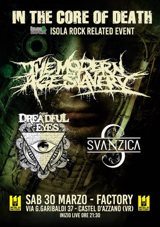 Sabato 30 Marzo i ragazzi di Isola Rock e il team del Metal in Factory suggelleranno un’importante collaborazione: uniranno le forze per una serata spaccaossa come poche altre! Sul palco del The Factory ci saranno: i The Modern Age Slavery, la band emiliana divenuta ormai storica e tra le più quotate del panorama estremo italiano. Con lei troveremo i Dreadful Eyes e gli Svanzica, due band entrambe autrici di un Melodic Death Metal di pregevolissima fattura!