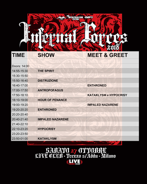 Mancano pochi giorni all’Infernal Forces 2018! Il nuovo festival marchiato Metalitalia.com, che vedrà sullo stesso palco KATAKLYSM, HYPOCRISY, IMPALED NAZARENE, ENTHRONED, HOUR OF PENANCE, ANTROPOFAGUS, DISTRUZIONE e THE SPIRIT, si terrà Sabato 27 ottobre al Live Music Club di Trezzo sull’Adda (MI).
