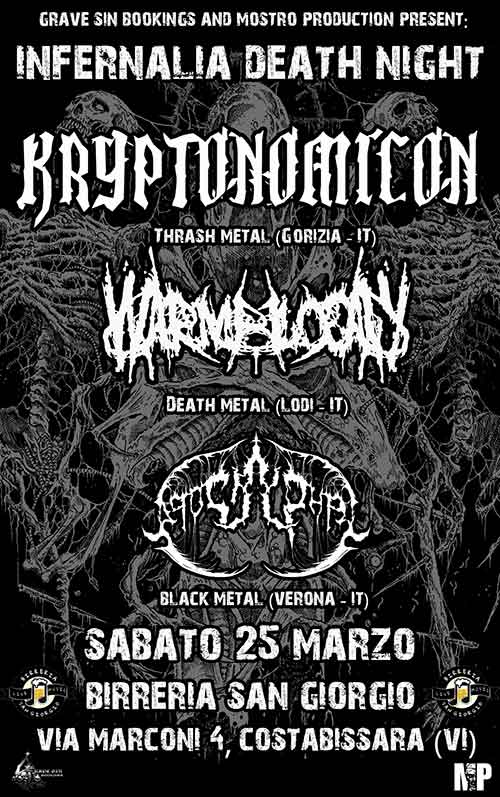 Mostro Production, in collaborazione con Grave Sin Booking, presenta l’evento denominato “Infernalia Death Night” con Kryptonomicon, Warmblood e Apocryphal per sabato 25 marzo Birreria San Giorgio a Costabissara (VI).
