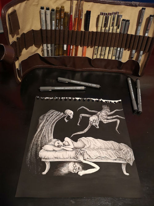 «Il nostro nuovo disco ‘The Rain Under’ racconta di oscurità, paure, incubi e disperazione. Volendo espandere il più possibile la proiezione della nostra musica, abbiamo chiesto a Elisabetta (che si esprime con il disegno oltre che con il canto) di creare un’immagine che rappresenti le atmosfere delle canzoni. La sua visione ha prodotto un’istantanea oppressiva e angosciante, talmente perfetta che abbiamo deciso di stamparne un numero limitato, numerate e autografate, per offrirle ai primi che pre-ordineranno il nostro disco».