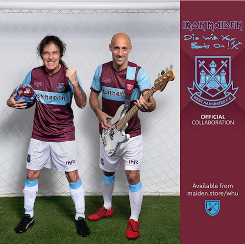 Il tifo di Harris, sempre ostentato magari indossando pantaloncini della sua squadra del cuore sul palco o con tracolle del basso con i colori del club ad esempio, rinnova il proprio legame e affetto con una maglietta del club in edizione speciale e denominata “Die With Your Boots On”. La maglietta reca i colori storici della squadra, ossia il bordeaux e l’azzurro, e le lettere IMFC nello stemma (cioè Iron maiden Footbal Club) e al nome Iron Maiden nello spazio al centro della t.shirt, dove abitualmente trova posto il nome dello sponsor. La maglia è stata commercializzata nello shop della band e trova come testimonial d’eccezione il giocatore degli Hammers, Pablo Zabaleta, argentino, con addosso la divisa in questione e il basso di Steve Harris, mentre il bassista regge un pallone.