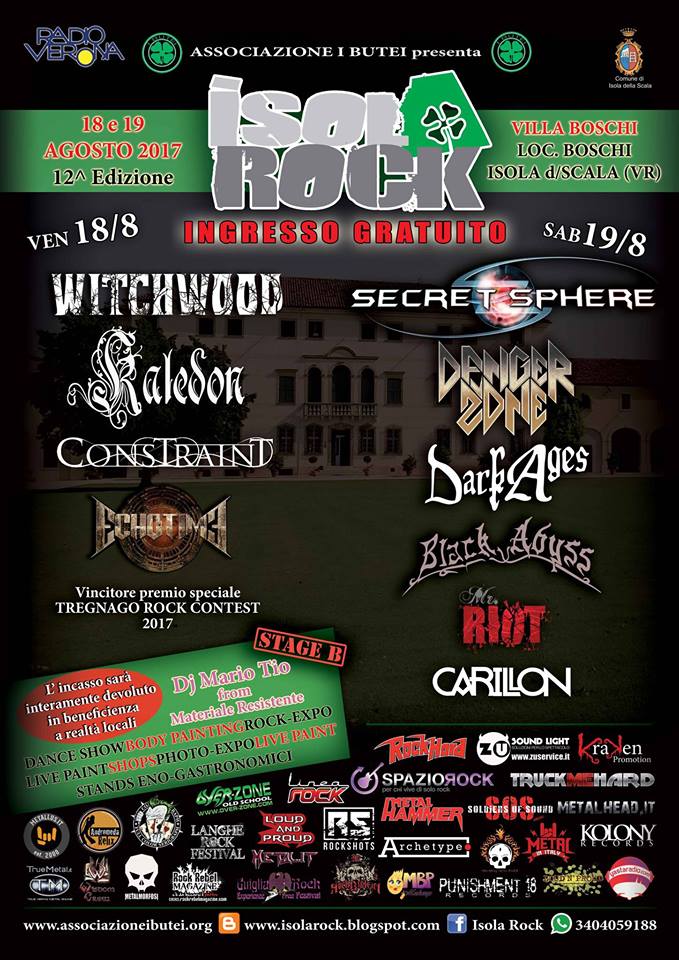 12 anni per ISOLA ROCK, la manifestazione musicale e culturale a scopo benefico organizzata dall’ ASSOCIAZIONE I BUTEI di Isola della Scala – VR, di cui 5 nella splendida location di VILLA BOSCHI (località Boschi – Isola della Scala – VR) confermata anche quest’anno per la due giorni all’ insegna del rock e metal underground. Un mix di generi e di show ai quali potrete assistere gratuitamente e per una buona causa, infatti tutto il ricavato va in beneficienza a realtà locali.
