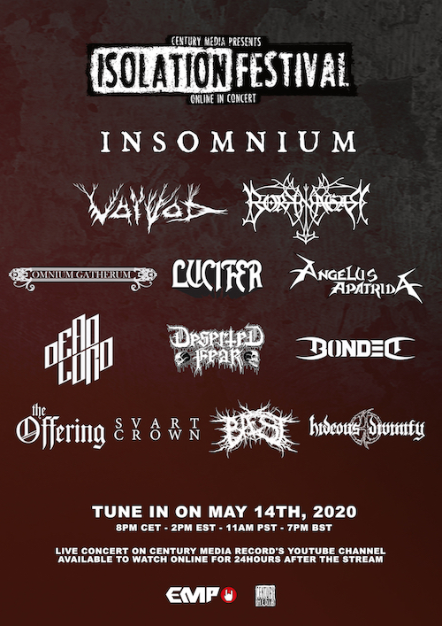 Questa sera Century Media Records in collaborazione con EMP ospiterà ISOLATION FESTIVAL, un online festival gratuito trasmesso sul canale YouTube di Century Media Records. Lo stream comincerà stasera alle ore 20:00 e sarà disponibile per 24 ore, QUI.