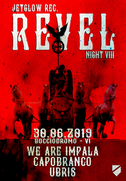 “L’ottava edizione della Revel Night, festival organizzato da Jetglow Recordings, si terrà il 30 Giugno 2019 e la location di quest’anno sarà il Bocciodromo di Vicenza. Sul palco si alterneranno i concerti di alcune delle band dell’etichetta; gli UBRIS apriranno le danze con il loro potente stoner rock, a seguire i CAPOBRANCO faranno ballare il pubblico con un rock che strizza l’occhio al funk e per cocludere gli spagnoli WE ARE IMPALA porteranno i presenti in una nuova dimensione post-rock. Sarà anche un’occasione per incontrare artisti che, in stretta connessione con la  musica, si esprimono in altro ambito; saranno presenti infatti, oltre a quello dell’etichetta, gli stand della serigrafia artistica The Mesh e degli artisti Raquel Burgueno Sepulveda, Fabiolous, Nicola Mel.