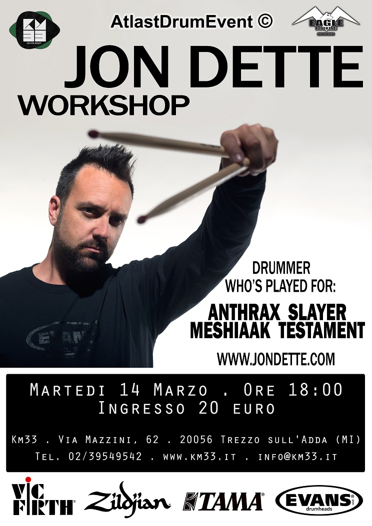 Il batterista Jon Dette, in occasione della sua data con ANTHRAX presso Live Music Club di Trezzo, sarà al KM33 per un workshop di batteria in cui condividerà la sua esperienza durante un incontro musicale e didattico. Appuntamento irrinunciabile per chi vuole approfondire a 360 gradi l’aspetto tecnico e artistico di questo strumento con un professionista di questo calibro.