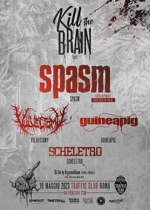 Traffic Club presenta un nuovo festival per gli amanti delle sonorità più estreme, il Kill The Brain Fest che proporrà grindcore, death metal e non solo. Parteciperanno infatti Spasm della Repubblica Ceca, i Vulvectomy, Guineapig e Scheletro.
