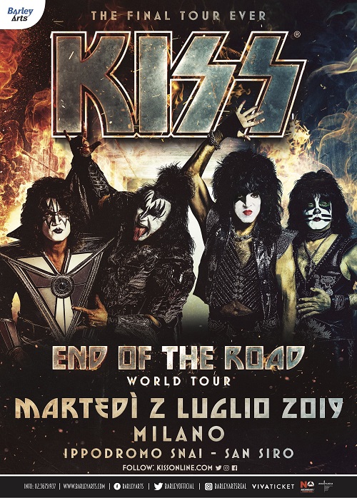 Dopo una straordinaria carriera lunga 45 anni che ha inaugurato l’era delle leggende del rock’n’roll, i KISS hanno annunciato che nel 2019 intraprenderanno il loro ultimo tour, non a caso chiamato END OF THE ROAD. Il primo annuncio è stato fatto un mese fa durante America’s Got Talent e ha mandato internet in tilt con fan speranzosi di avere la band nella loro città per godersi un ultimo, grande show.