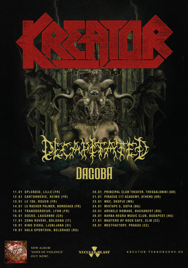 Da gennaio i KREATOR visiteranno le città in cui non hanno ancora suonato di recente e saranno accompagnati dai compagni d’etichetta DECAPITATED e dai DAGOBA. L’unica data italiana si terrà il 17 gennaio 2018 a Zona Roveri, Bologna.