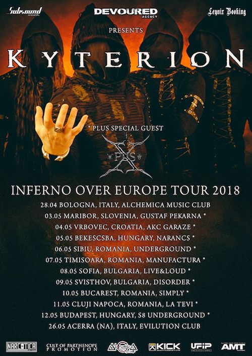 I black metallers Kyterion annunciano le date del loro tour europeo a supporto del nuovo album “Inferno II”, in uscita il 4 Maggio 2018 per Subsound Records. “Inferno Over Europe 2018” avrà inizio ad Aprile proseguendo per gran parte del mese di Maggio, e vedrà la band impegnata in 12 date attraversando 6 diversi paesi.