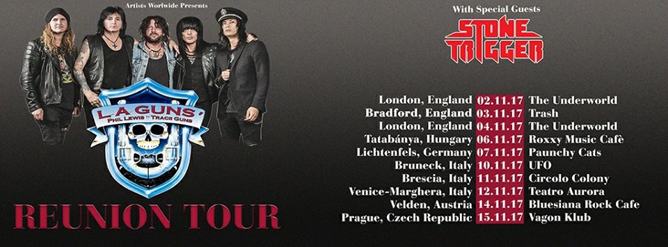 Insieme a loro, ospiti speciali di tutto il Tour, gli irlandesi STONE TRIGGER: tra i nomi più caldi del nuovo rock europeo, la band si è già esibita insieme a pesi massimi del Classic Rock come Eric Martin, John Corabi e Faster Pussycat: il loro mix letale di riff tiratissimi e ritornelli da stadio li ha già resi degli idoli in patria, e sicuramente faranno breccia anche nelle orecchie e nei cuori dei fans italiani!