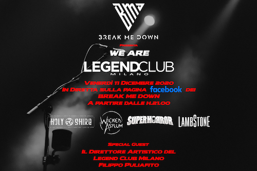 Insieme a noi Break Me Down ci saranno i SuperHorror, gli Holy Shire, le Wicked Asylum e i Lambstone, per aiutare il Legend a raggiungere il traguardo del suo crowdfunding, lanciato su Produzioni Dal Basso, attraverso le nostre esperienze di musicisti che hanno calcato il suo palco e grazie ad esso hanno raggiunto un piccolo grande traguardo.