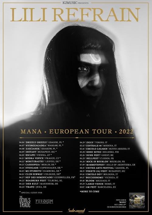 Inoltre LILI REFRAIN partirà per un tour europeo organizzato da K2 Music Management: si inizia il 6 aprile a Gdansk in Polonia passando per festival come Roadburn e Hellfest .