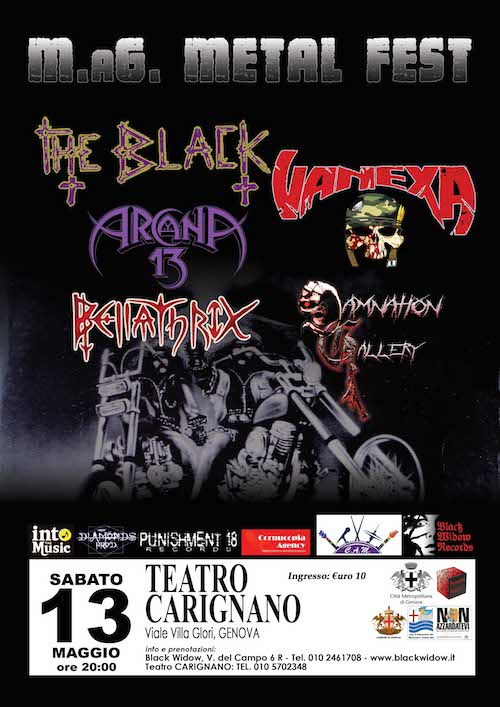 Si svolgerà il 13 maggio a Genova il m.aG. Metal Fest 2017, con Vanexa, The Black, Arcana 13, Belllathrix e Damnation Alley. Il tutto avverrà al Teatro Carignano, in Viale Villa Glori.