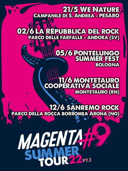 Di seguito le date dei concerti che i Magenta#9 terranno prossimamente. Parte infatti il “Summer Tour 2022 pt.1” dei Ceffi della Bolognina! La band dei Magenta#9 a partire da sabato 21 maggio sarà già impegnata in varie date nella penisola. Tuttavia seguiranno aggiornamenti e nuove date.
