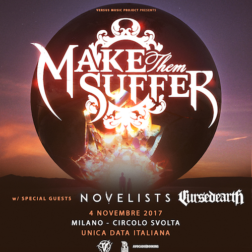 VERSUS MUSIC PROJECT è felice di presentare l’arrivo in Italia degli Australiani MAKE THEM SUFFER, finalmente per la prima volta da headliner nel nostro paese. La band presenterà le nuove sfumature del sound maturato con il nuovo album “Worlds Apart”, in uscita a fine Luglio per Rise Records, come anche i classici amati dai fan. Insieme a loro una garanzia europea, i francesi NOVELISTS che già abbiamo potuto apprezzare sul palco del DISSONANCE FESTIVAL 2017 e gli stessi Australiani CURSED EARTH.