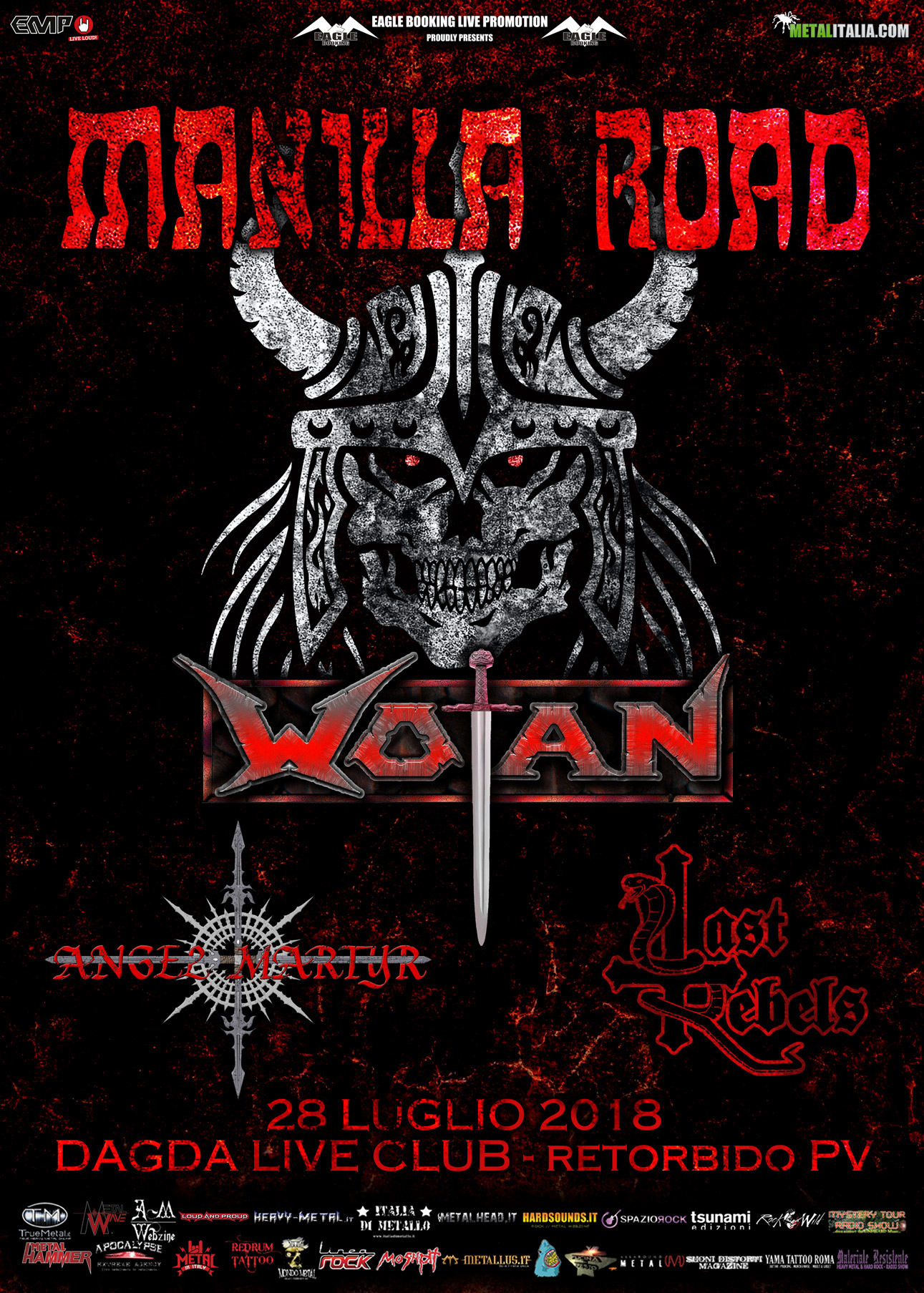 Sarà una serata tutta all’insegna dell’epic metal quella prevista per Sabato 28 Luglio presso il Dagda Live Club di Retorbido (Pv). Ad accompagnare i MANILLA ROAD in questa epica serata ci saranno infatti alcune delle eccellenze nazionali del genere, a cominciare dai WOTAN; formazione milanese attiva già nel 1988 che calcherà il palco dell’ormai noto locale per uno dei loro rari show tra scenografie, elmi e spade.