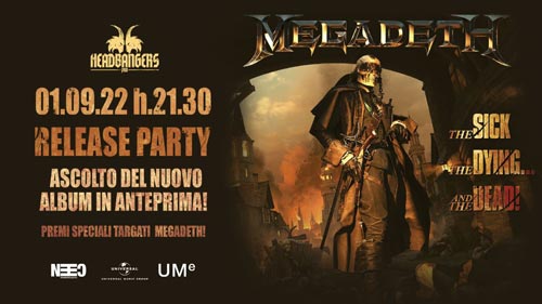 Giovedì 1° settembre dalle 21.30 l’Headbangers Pub di Milano presenterà in anteprima l’ascolto del nuovo album dei Megadeth, “The Sick, The Dying… And The Dead!”, in uscita il 2 settembre su Universal.