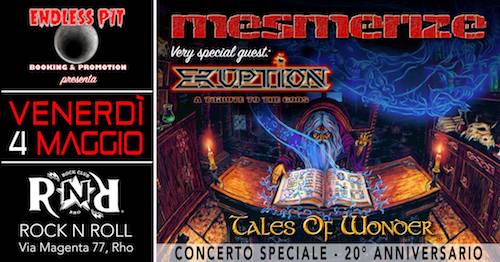 La storica Heavy Metal band milanese dei MESMERIZE torna al ROCK’N’ROLL di Rho (MI) VENERDI’ 4 MAGGIO 2018 con un concerto ESCLUSIVO per festeggiare il 20° anniversario del loro disco d’esordio “Tales Of Wonder”: la scaletta del concerto sarà infatti incentrata sui brani di quell’album, alcuni dei quali non suonati da oltre un decennio e rimasti indiscutibilmente nel cuore di molti fan!