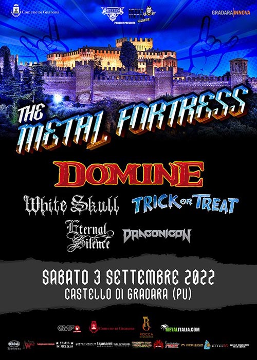 Si terrà il 3 Settembre 2022 la prima edizione del METAL FORTRESS, evento ospitato nella splendida e suggestiva cornice offerta dal Castello del Comune di Gradara (PU), maniero famoso per essere stato il luogo dove si è consumata la tragedia, riportata poi da Dante nella Divina Commedia, di Paolo Malatesta e Francesca da Rimini. Un luogo carico di fascino e mistero, preservato in maniera eccellente dall’inesorabile scorrere del tempo.Ad esibirsi sul palco, appositamente allestito all’interno delle mura, troveremo tre band che hanno contribuito attivamente alla crescita del metal italiano: i DOMINE, formazione leggendaria capitanata dal carismatico Morby, i WHITE SKULL, in procinto di pubblicare il loro nuovo album, e i TRICK OR TREAT, attualmente impegnati nelle date a supporto del nuovo lavoro in studio “Creepy Symphonies”.