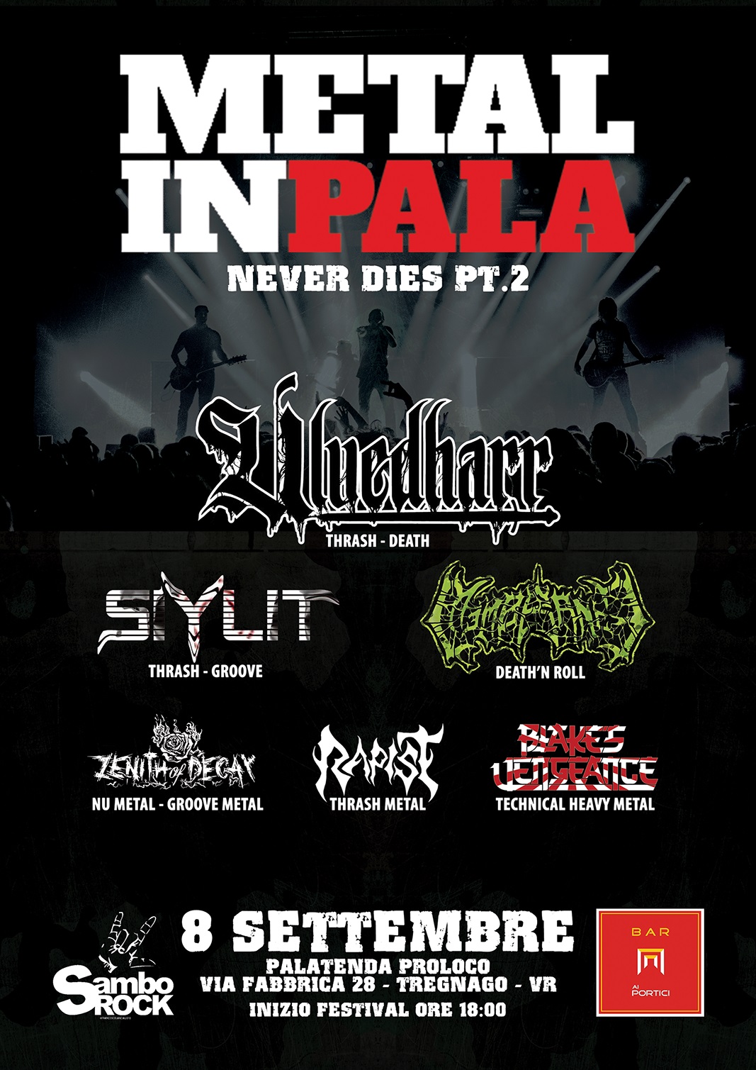 Con loro si esibiranno: SIYLIT (thrash-groove da Verona), MEMBRANCE (Death’n Roll da Venezia), RAPIST (thrash metal da Padova), BLAKE’S VENGEANCE (technical heavy metal, da Milano) e ad aprire il festival gli emergenti ZENITH OF DECAY (nu metal/groove metal, da Verona)