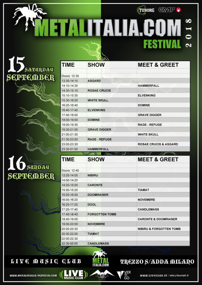 Metalitalia.com, Eagle Booking e Vertigo sono liete di annunciare gli orari dei meet&greet con le band del Metalitalia.com Festival 2018! I meet & greet si terranno sotto la tensostruttura nell’area esterna del Live Music Club e saranno gratuiti e aperti a tutto il pubblico.