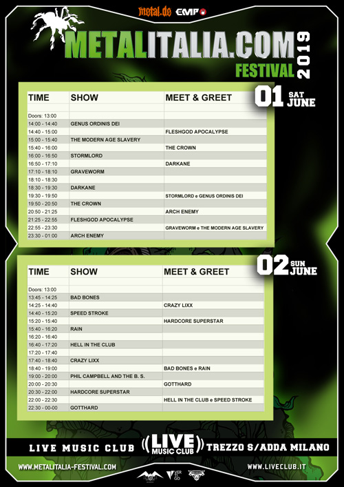 Come da tradizione, al Metalitalia.com Festival 2019 potrete incontrare gli artisti che si esibiranno durante le giornate in meet&greet gratuiti e aperti a tutto il pubblico! Qui di seguito il programma completo degli show e dei meet&greet che si terranno sotto la tensostruttura nell’area esterna del Live Club.