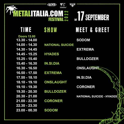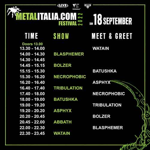 Procedono i preparativi per il Metalitalia.com Festival 2022 in programma per 17 e 18 settembre e oggi siamo lieti di annunciare gli orari dei concerti e dei meet&greet gratuiti e aperti a tutto il pubblico!