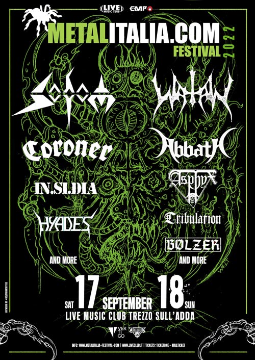 Dopo due anni di stop forzato, Metalitalia.com, Vertigo e Cerberus Booking sono liete di guardare con ottimismo al futuro e annunciare le prime band per il Metalitalia.com Festival 2022! L’evento, in programma per metà settembre, questa volta sarà rivolto al metal più duro, infernale e oscuro, per due giorni di musica estrema al Live Music Club di Trezzo Sull’Adda.