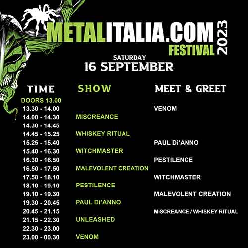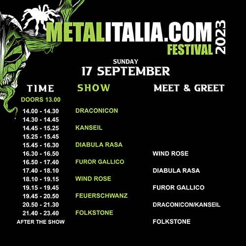 Manca poco al Metalitalia.com Festival 2023 in programma per il 16 e 17 settembre e oggi siamo lieti di annunciare gli orari dei concerti e dei meet&greet gratuiti e aperti a tutto il pubblico!