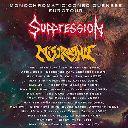 La technical thrash/ death metal band italiana Miscreance inaugura il tour europeo, insieme ai Suppression, domani da Belgrado. Il Monochromatic Consciousness Eurotour si prolungherà fino al 28 maggio al GoatHell Fest in Ungheria, mentre il 12 e 13 dello stesso mese i Miscreance saranno a Torino presso lo Ziggy e al Black Inside di Milano.