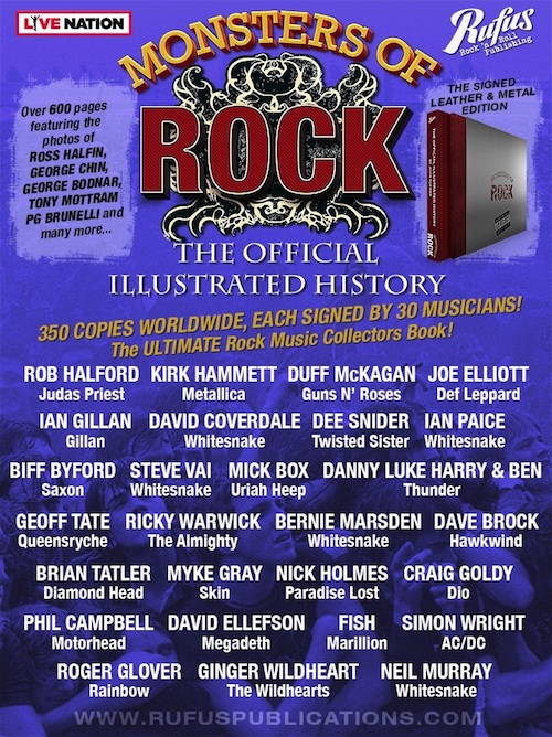 Live Nation e Rufus Rock N Roll Publishing presentano una pubblicazione sul Monsters Of Rock. Una storia di uno dei più importanti eventi live della musica metal, attraverso una serie di immagini. Il libro è stato scritto dal giornalista John Tucker, il quale ha usato anche del materiale aggiuntivo e ufficiale del festival, prodotto dal PR Judy Totton e da tutti i promoter del festival nel corso degli anni. Il libro ripercorre le edizioni dal 1980 al 1996 attraverso ben 600 pagine, nelle quali si trovano articoli, storie, interviste, informazioni e set list, oltre a tantissime foto.