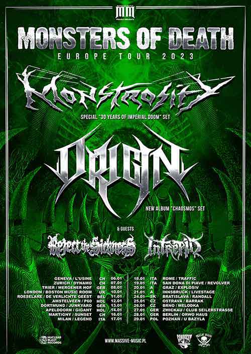 I Monstrosity annunciano il “Monsters of Death” European Tour nel prossimo gennaio. Con la death metal band statunitense anche Origin, technical death metal, e in apertura i belgi Reject The Sickness e gli estoni Intrepid. Il tour comprende l’Italia con ben tre date: Milano il 17 gennaio, Roma il 18 e San Dona Di Piave il 19.