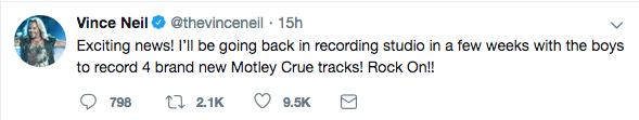 Con un post su twitter, Vince Neil, vocalist dei Mötley Crüe, avrebbe dichiarato di essere prossimo al recarsi in studio con i ragazzi per registrare 4 nuovi brani: