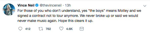Ovviamente si è scatenato un tam tam mediatico, specialmente per il fatto che i Crüe non sarebbero più in attività, con tanto di firma di contratto. Ma, come in un successivo tweet lo stesso Vince dichiara, la band ha firmato un contratto per non andare più in tour (dopo il massiccio ultimo “The Final Tour” del 2015, che incluse 164 spettacoli per un incasso totale di oltre 100 milioni di dollari), ma non si è mai sciolta e non ha mai dichiarato di smettere di far musica: