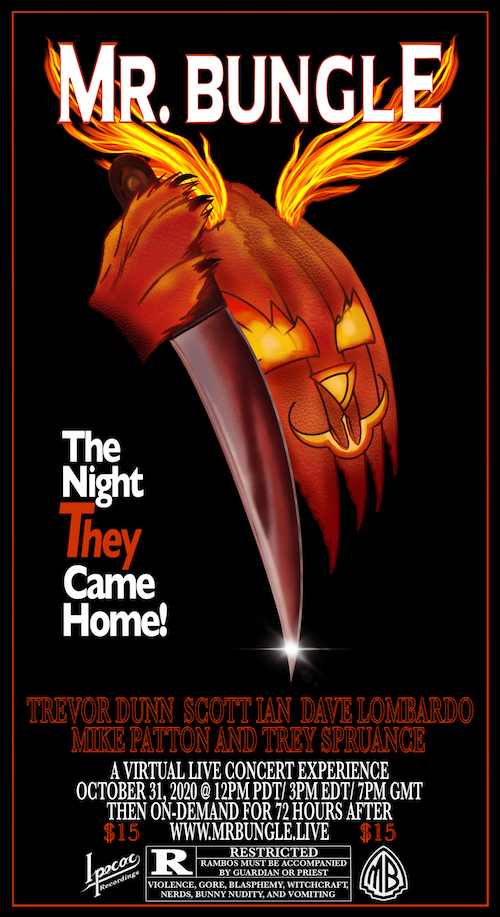 Annunciato l’album “The Raging Wrath of the Easter Bunny Demo” per il 30 ottobre con Ipecac Recordings, dopo ben ventun anni dall’ultimo, i Mr. Bungle annunciano un concerto per il giorno di Halloween. L’evento è stato denominato “The Night They Came Home” e in esso andranno dunque in azione Mike Patton, Trevor Dunn, Trey Spruance, Scott Ian e Dave Lombardo. Per assitere all’evento 15$, QUI. Il concerto si terrà dunque il 31 ottobre alle 20 ore italiane, e on demand per le successive 72 ore. per l’occasione la band ha realizzato anche del merchandising dedicato.