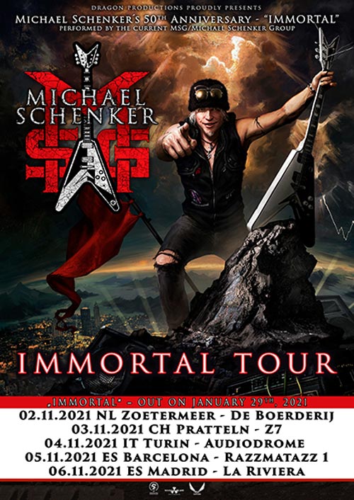 Michael Schenker dichiara: “Un nuovo show con la mia nuova grandiosa line-up MSG per celebrare il mio 50° anniversario di carriera e anche il nuovo album ‘Immortal’. Sono emozionato. Non vedo l’ora di suonarlo dal vivo davanti a tutti i fan del rock’n’roll. Non perdetevi i concerti; siamo ben in ritardo per essere di nuovo insieme e dal vivo”.