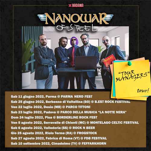 “Dopo quasi vent’anni di attività come Nanowar Of Steel abbiamo raggiunto una maturità manageriale che ci permette di definirci ‘professionisti della professionalità’. Vi aspettiamo quest’estate sulla via dei TOUR MANAGERS carichi per un’esperienza carica di intrattenimento business-class!”