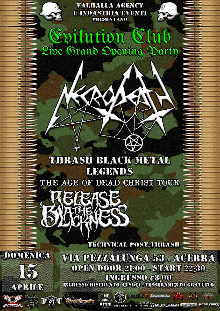 Inizia ufficialmente domenica 15 aprile la collaborazione tra Valhalla Agency ed Indastria Eventi con l’Evilution Club, locale in cui la programmazione live sarà interamente dedicata al Metal. E non poteva esserci inizio migliore se non avere i leggendari NECRODEATH come ospiti della Grand Opening. La storica Thrash/Black band ligure ha recentemente rilasciato il dodicesimo album, “The Age of Dead Christ”, cui segue un tour capillare della nostra Penisola. Il “The Age of Dead Christ Tour” farà tappa anche a Napoli, dando ai NECRODEATH l’onore di dare il battesimo di fuoco all’Evilution Club.
