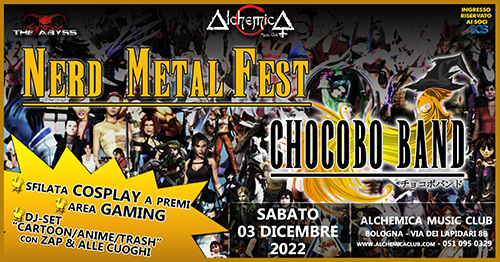 Sabato 3 dicembre dalle ore 21.00 si terrà il Nerd Metal Fest all’Alchemica Music Club di Bologna. Sarà una serata a tema metal e videogame con il concerto della Chocobo Band, progressive symphonic metal band ispirata alle musiche di Final Fantasy.